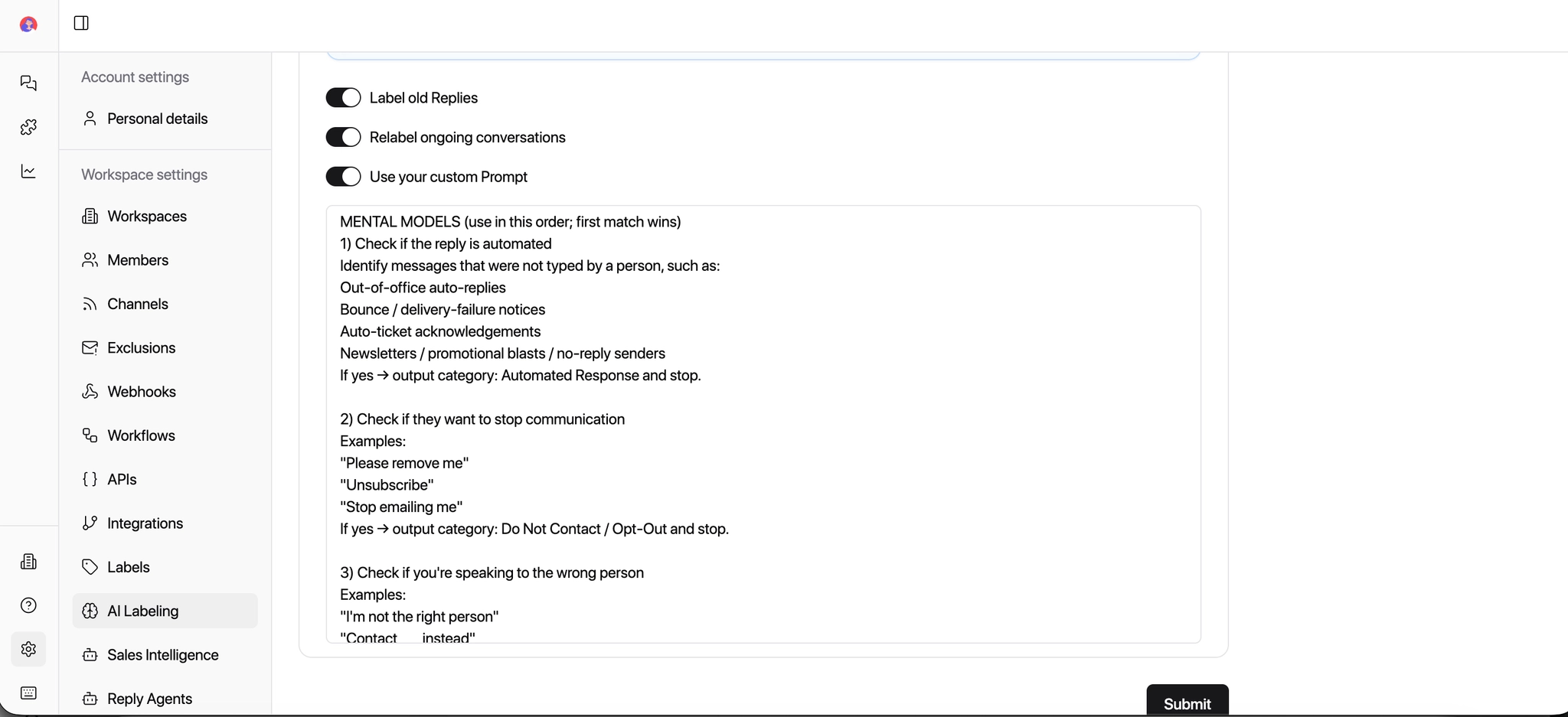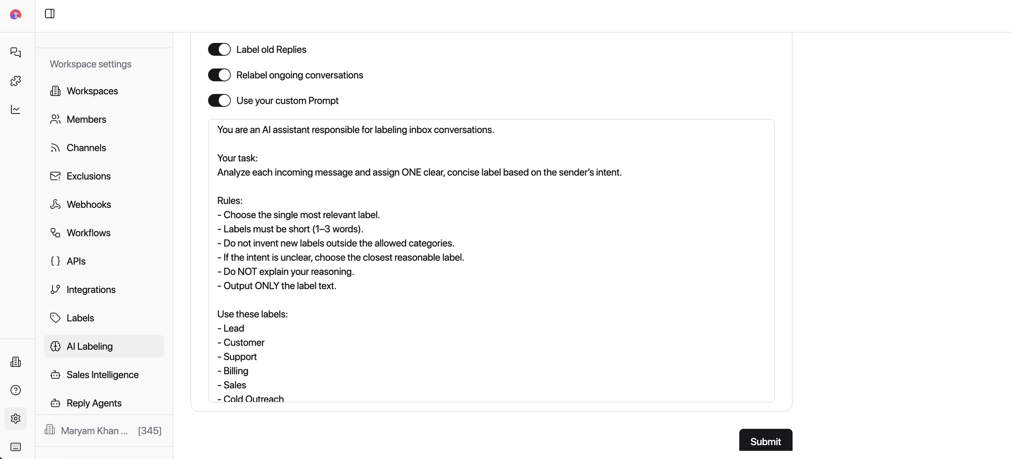 Keep this toggle ON to update labels automatically as conversations evolve. Useful when a prospect's intent changes over time.